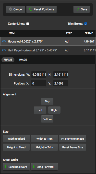 Once the Positioning Tool is open, users can start moving ads or ad reservations into their proper positions. The Positioning Tool gives the user a multitude of options for fine adjustments.