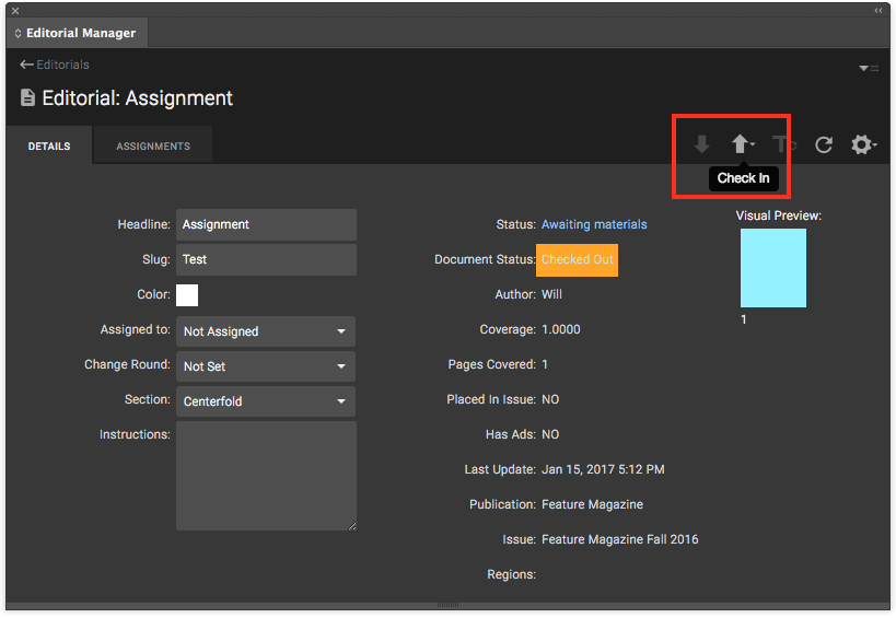 Once a document has been linked to an editorial in Virtual Publisher, it will be checked out automatically and ready to be worked on by the user. When a user is done working on a document, they will check the file back in which will save the changes made. When the user is ready to work on the document again, the user will check the document out.