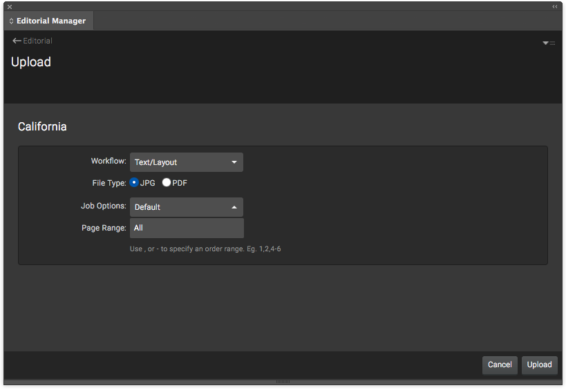 When a user is finished working on a document, users can upload their files directly from the plugin as either JPG previews or hi-res, print-ready PDFs.