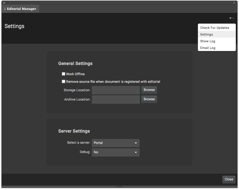 Once you have installed the Editorial Manager plugin, users must configure a storage location for Virtual Publisher on their machine. This location will become the shared space where Virtual Publisher will handle files uploaded from InDesign. To set the storage location, select the dropdown in the top-right of the plugin and select Settings from the dropdown menu. Once you are in the plugin settings under General Settings, you will see the Storage Location field. Select Browse and choose where you would like to store files.